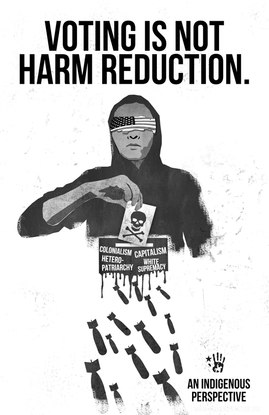 An argument against voting from an indigenous perspective. “If voting is the democratic participation in our own oppression, voting as harm reduction is a politics that keeps us at the mercy of our oppressors.”